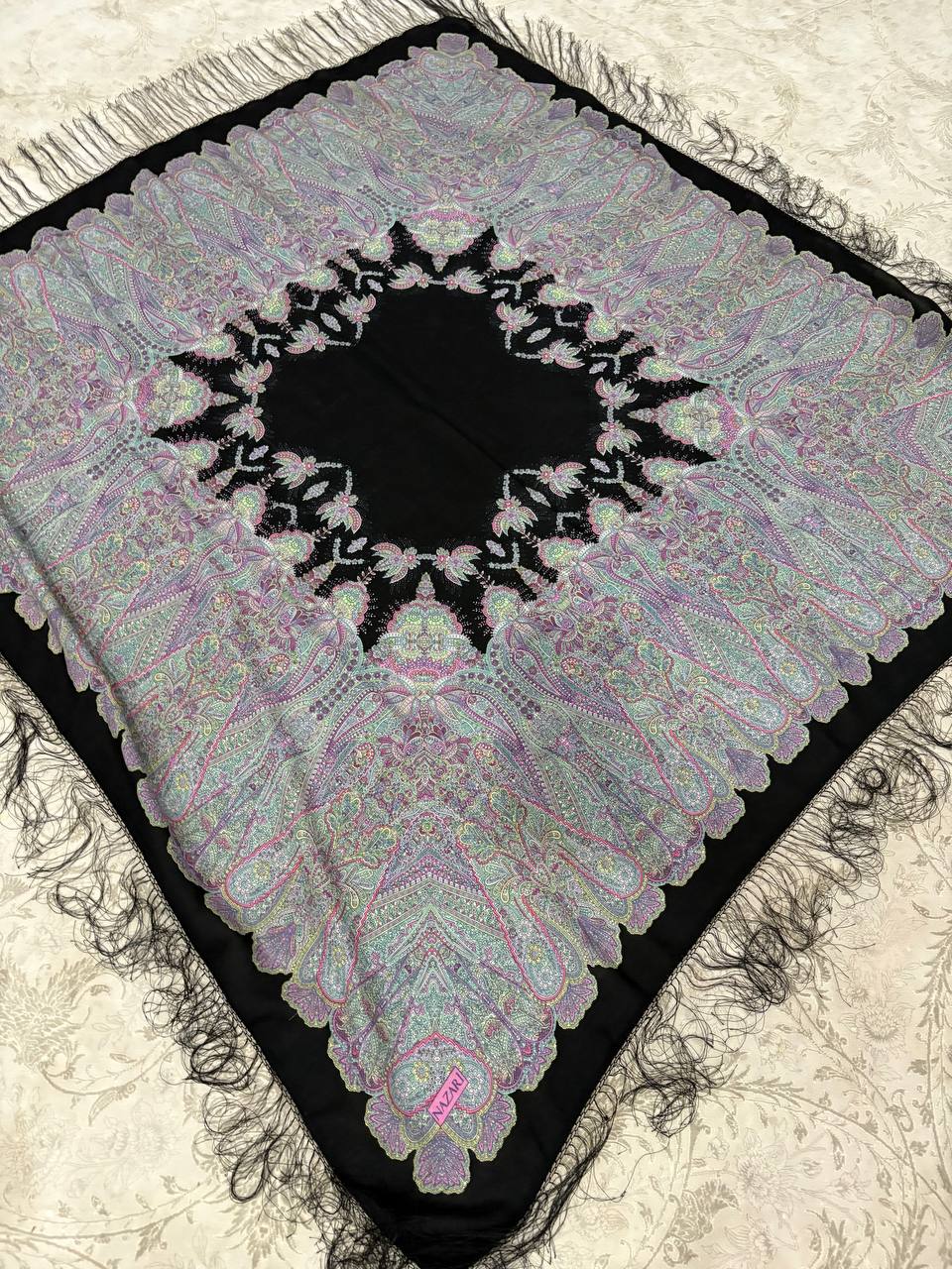برند: نظری نوع: چارقد ایتالیایی اصل جنس: ابریشم مصنوعی درجه یک طرح: بتهجقه سنتی متقارن رنگ زمینه: مشکی ترکیب رنگ: بنفش، سبز یشمی و طوسی حاشیه: مشکی ریشهدار ظریف ابعاد: قواره بزرگ مجلسی: .