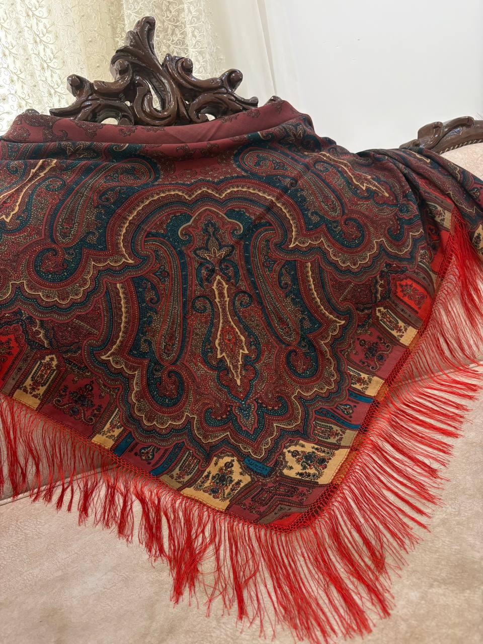 چارقد ایتالیایی مایا با الهام از نقوش کلاسیک و رنگبندی گرم و فاخر، انتخابی بینظیر برای بانوانیست که به استایل اصیل و چشمنواز اهمیت میدهند. حاشیه ریشهدار و طرح ترمهمانند آن، جلوهای مجلسی و خاص به پوشش شما میبخشد.