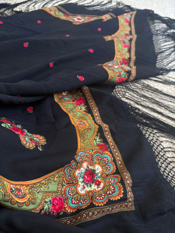 چارقد طرح گنبدی ترکمن از برند دلاری با زمینه تیره و نقوش اصیل سنتی، جلوهای فاخر و چشمنواز به استایل شما میبخشد. حاشیه ظریف گنبدی با گلدوزی الهامگرفته از هنر ترکمن، این چارقد را به انتخابی خاص برای سلیقههای کلاسیک تبدیل کرده است.