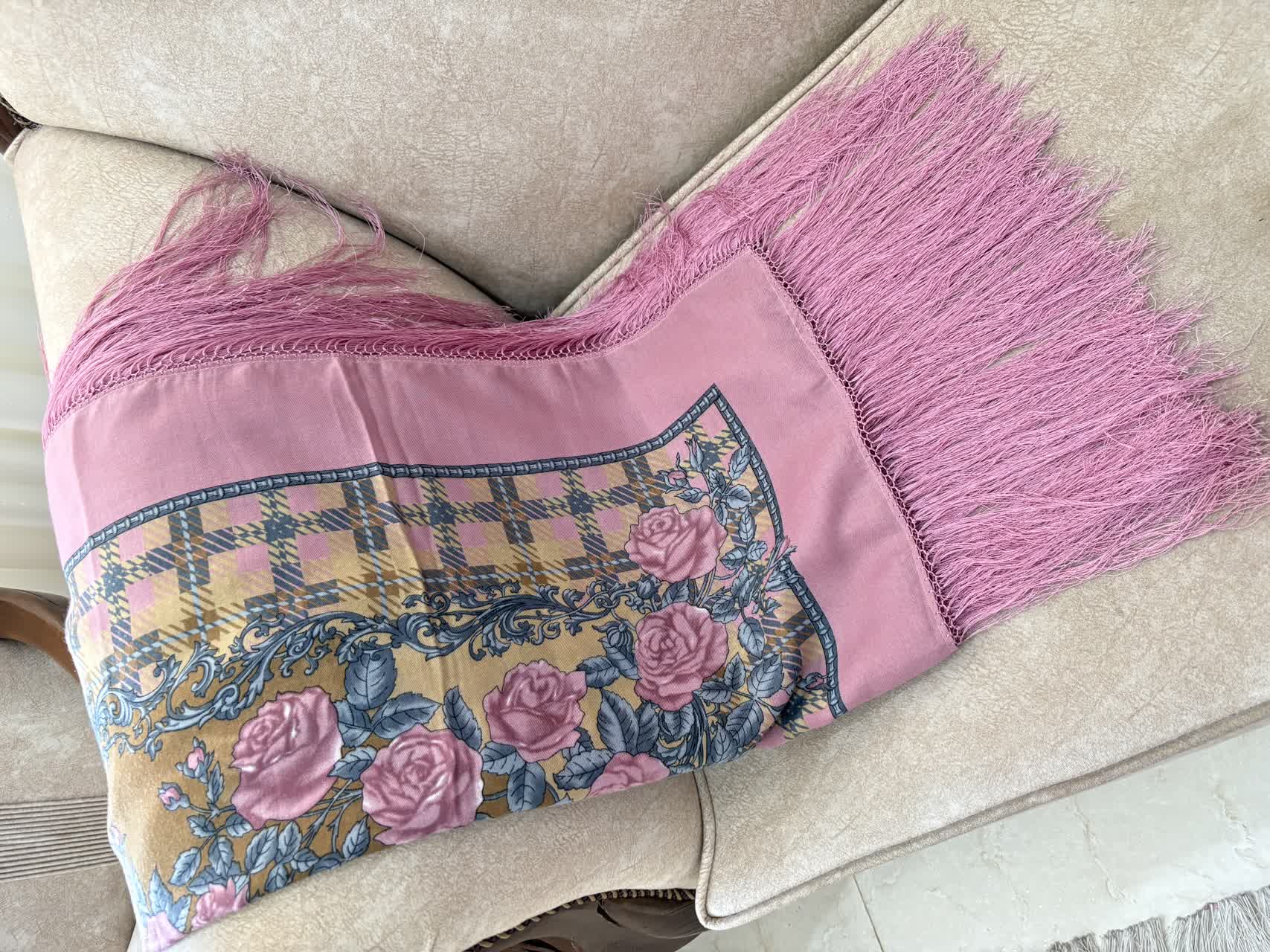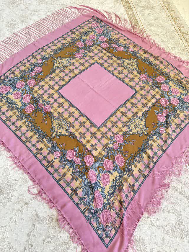 چارقد ایتالیایی با طرح اصیل بتهجقه و ترکیب رنگ ملایم صورتی–پاستلی، انتخابی ظریف و چشمنواز برای استایلهای کلاسیک و مجلسی. حاشیه ریشهدار و چاپ دقیق، جلوهای لوکس و خاص به این چارقد داده است