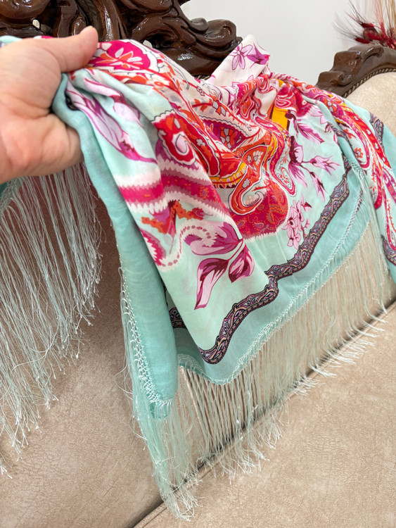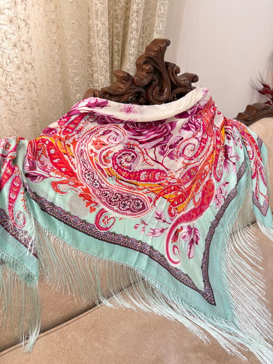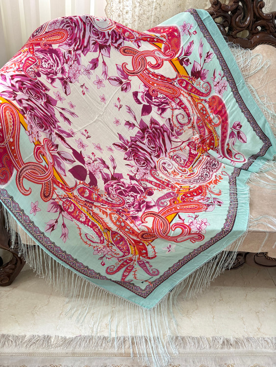 چارقد ایتالیایی با طرح اصیل بتهجقه و ترکیب رنگ ملایم و پاستلی، انتخابی ظریف و چشمنواز برای استایلهای کلاسیک و مجلسی. حاشیه ریشهدار و چاپ دقیق، جلوهای لوکس و خاص به این چارقد داده است✨🌸