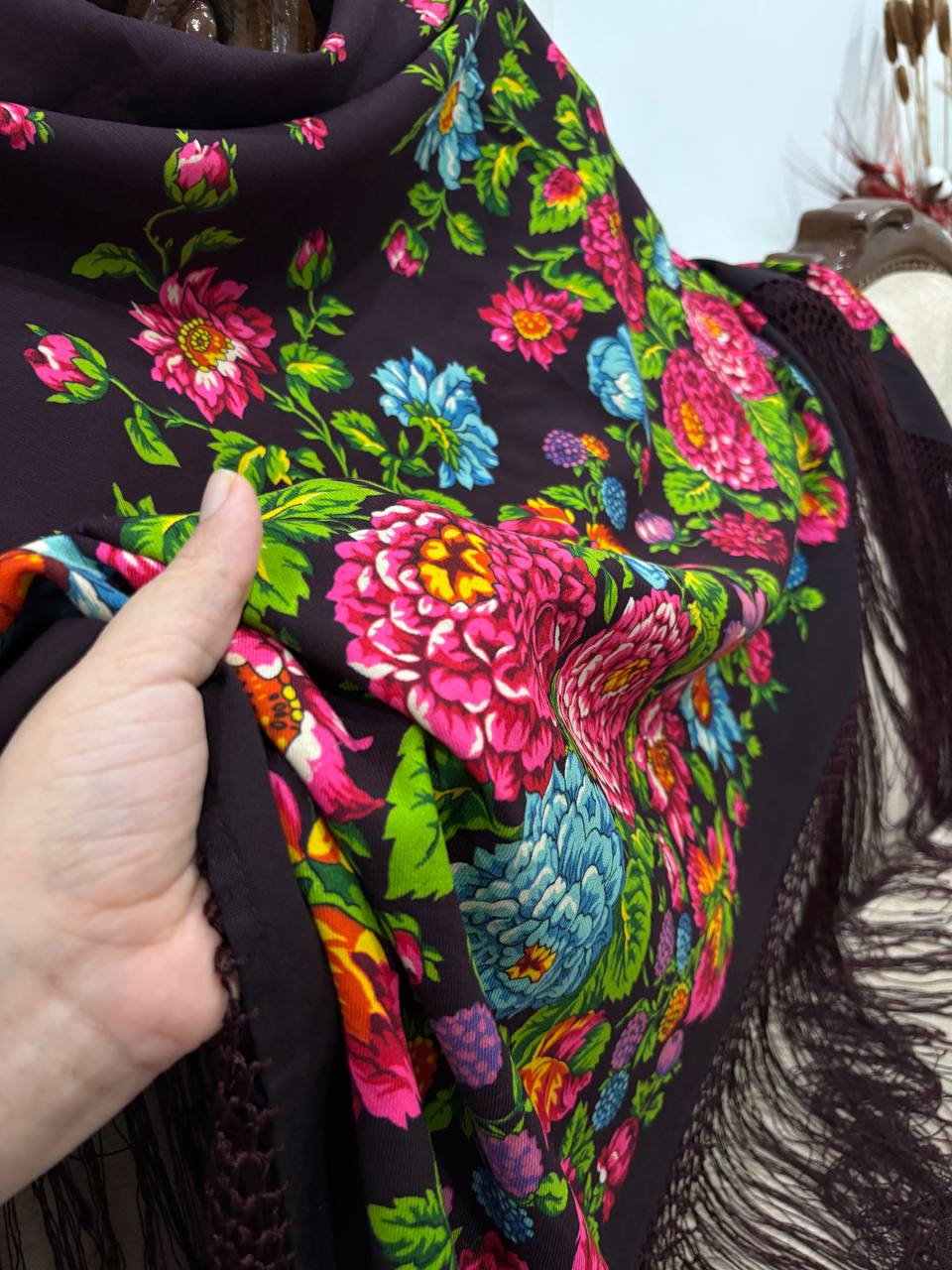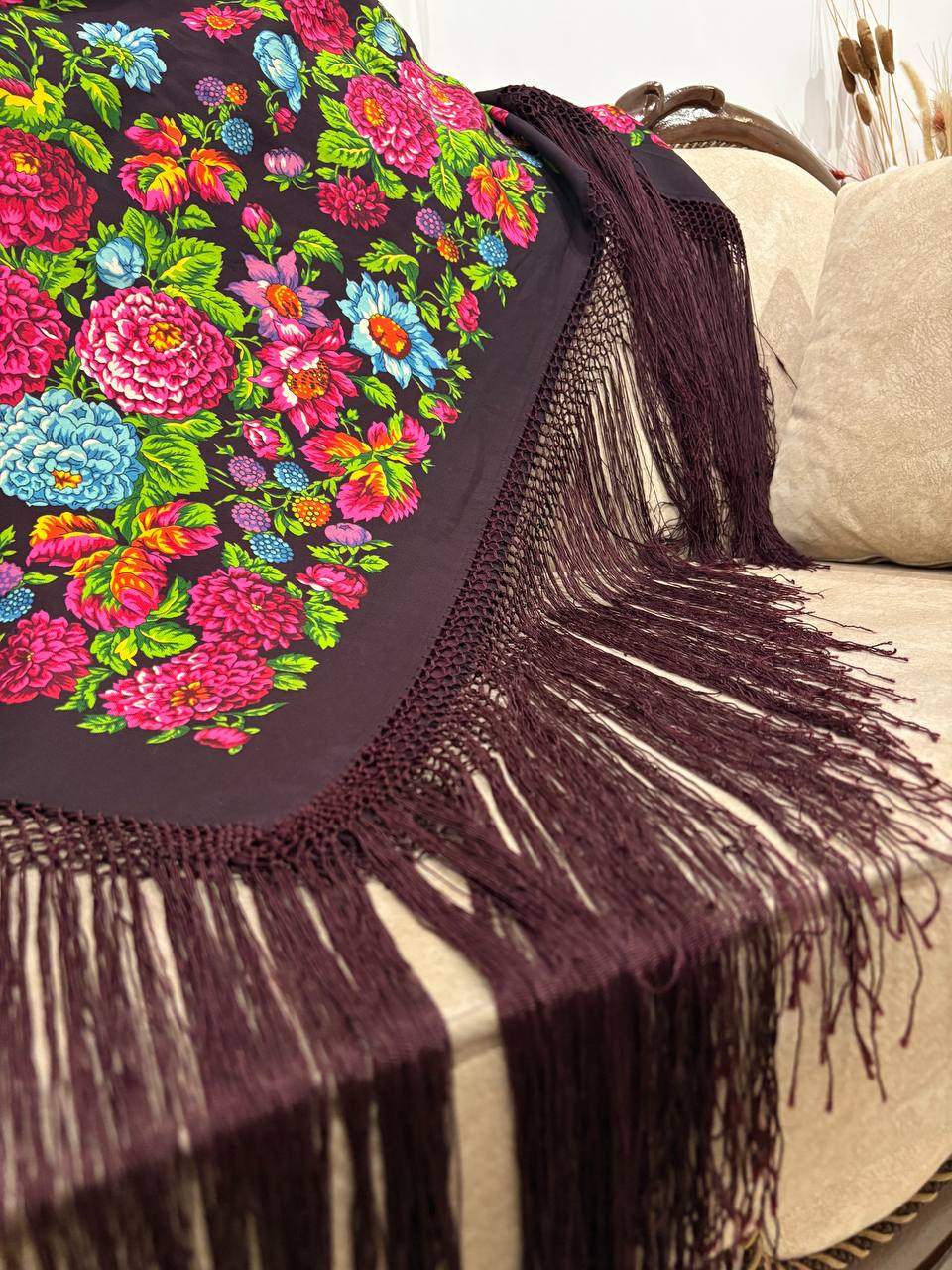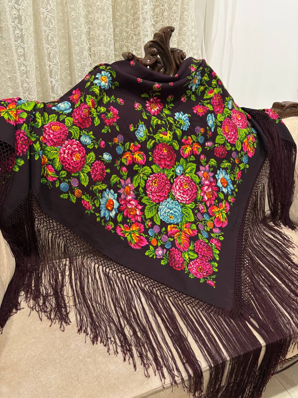 چارقد پشمی خاص با ترکیب چشمنواز رنگهای تیره و نقوش گلدار اصیل ترکمنی، جلوهای فاخر و خاص به استایل شما میبخشد. بافت لطیف، طرح پرجزئیات و ریشهدوزی ظریف، این چارقد را به انتخابی ایدهآل برای بانوان خوشسلیقه تبدیل کرده است ریشه نیم متری