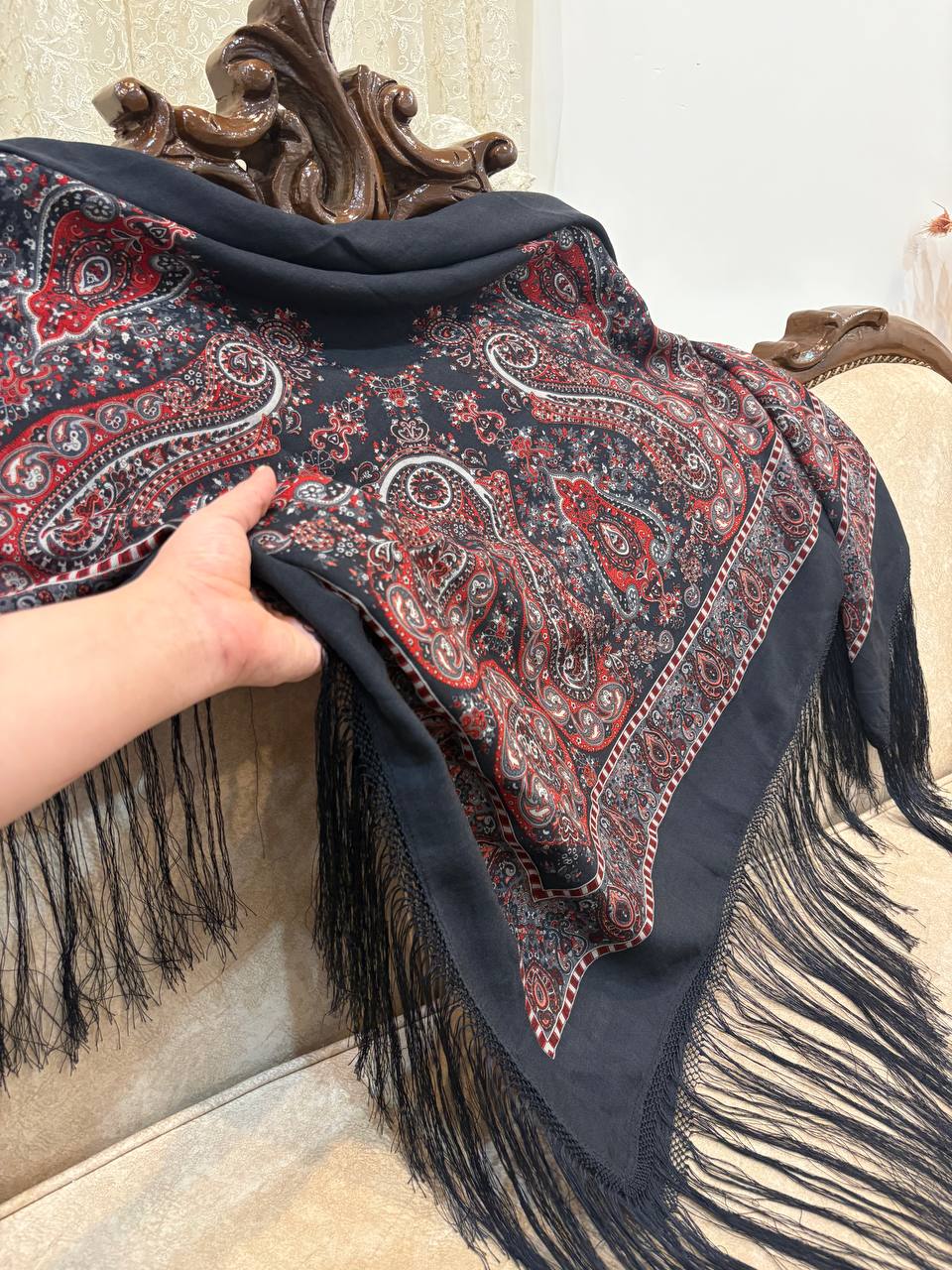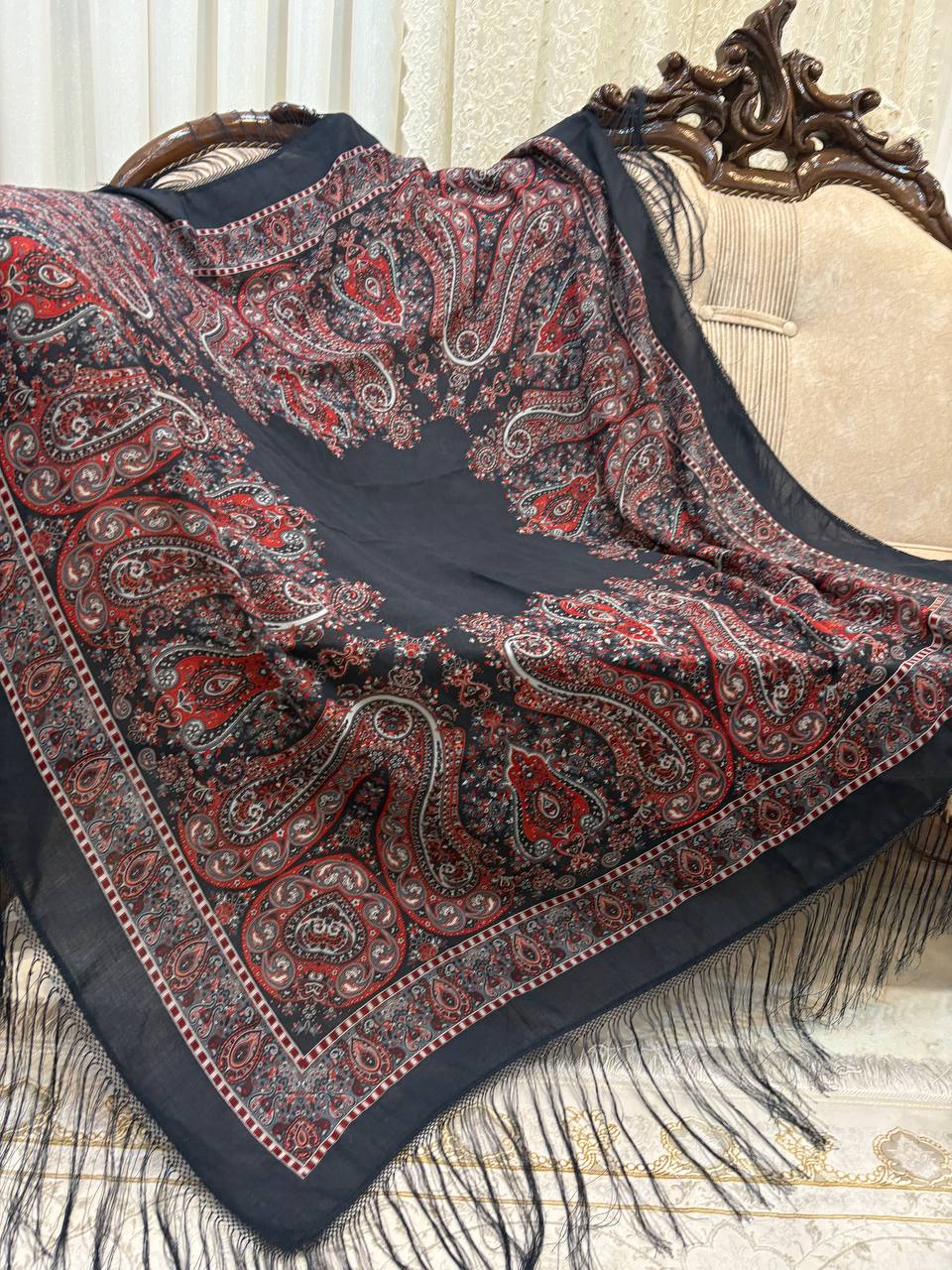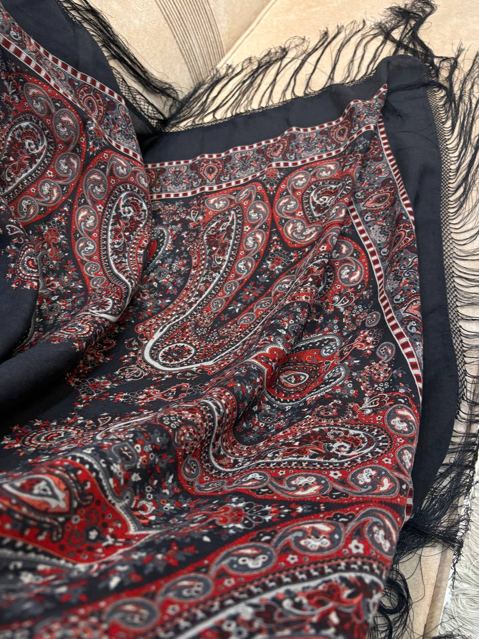 چارقدی شیک با رنگ زغالی عمیق و طرح ریز چشمنواز، با پارچهای لطیف و ایستایی زیبا؛ مناسب استفاده روزمره و استایلهای رسمی✨
