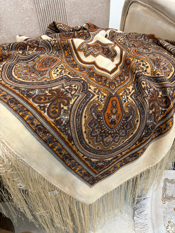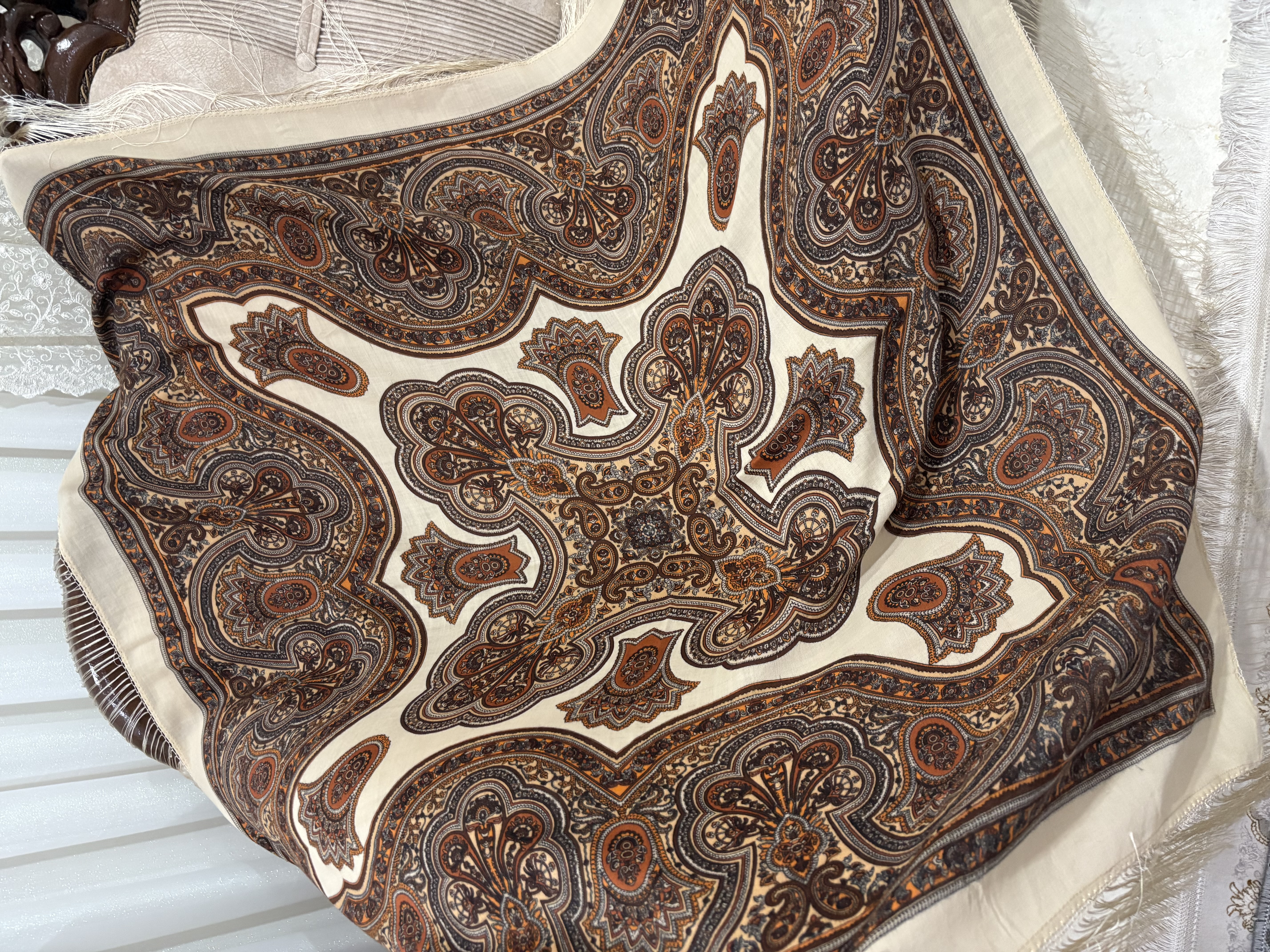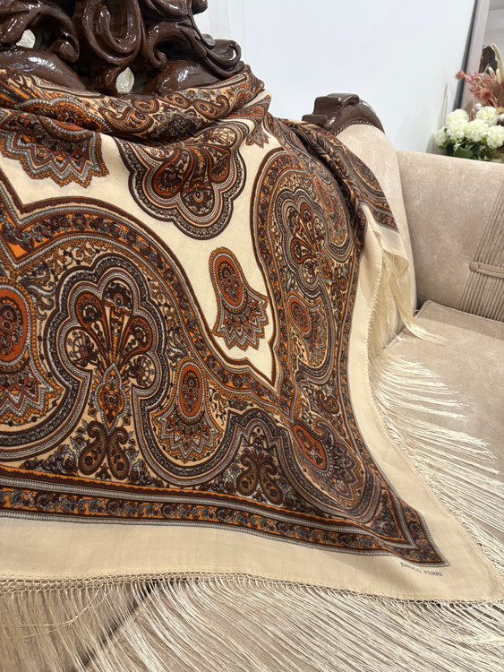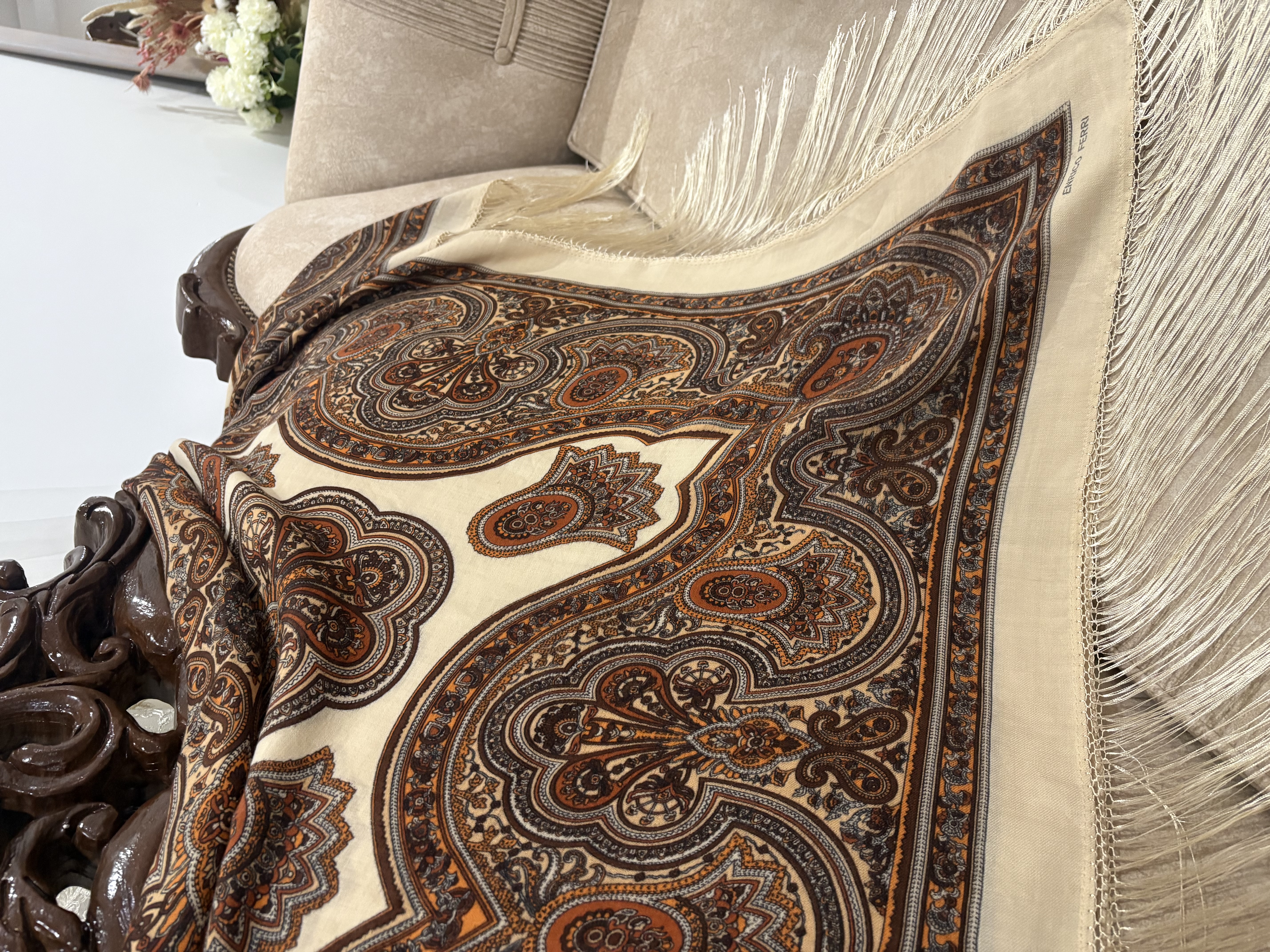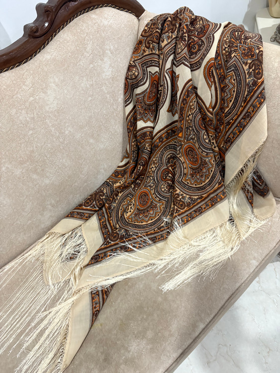 چارقد ایتالیایی از (برند کمیاب انریکه فیری) ،زمینه روشن با نقش ونگار شکلاتی و ریشه های شیری عروسانه،حسابی غوغا پیدا کرده، رنگ بهاری و شیک یه ترکیب بی نظیر برای روزهای بهار تابستان وحتی پاییز هزار رنگ.