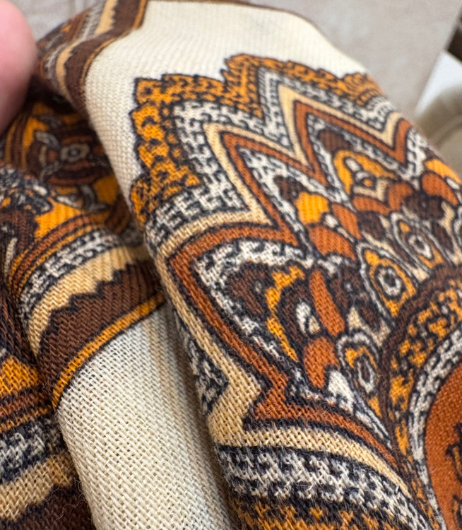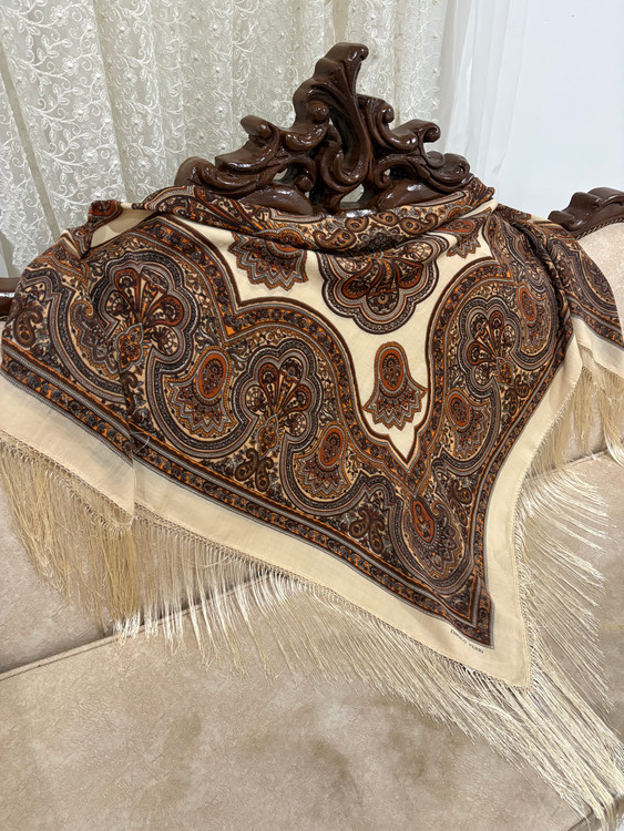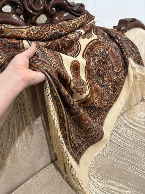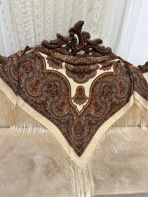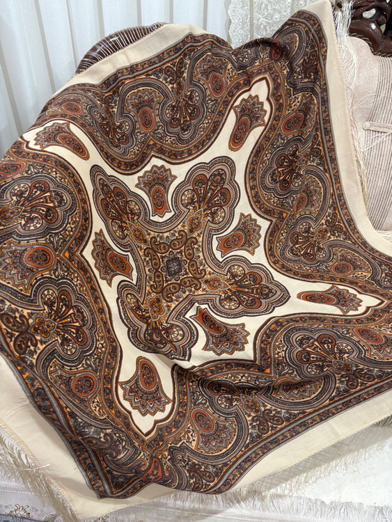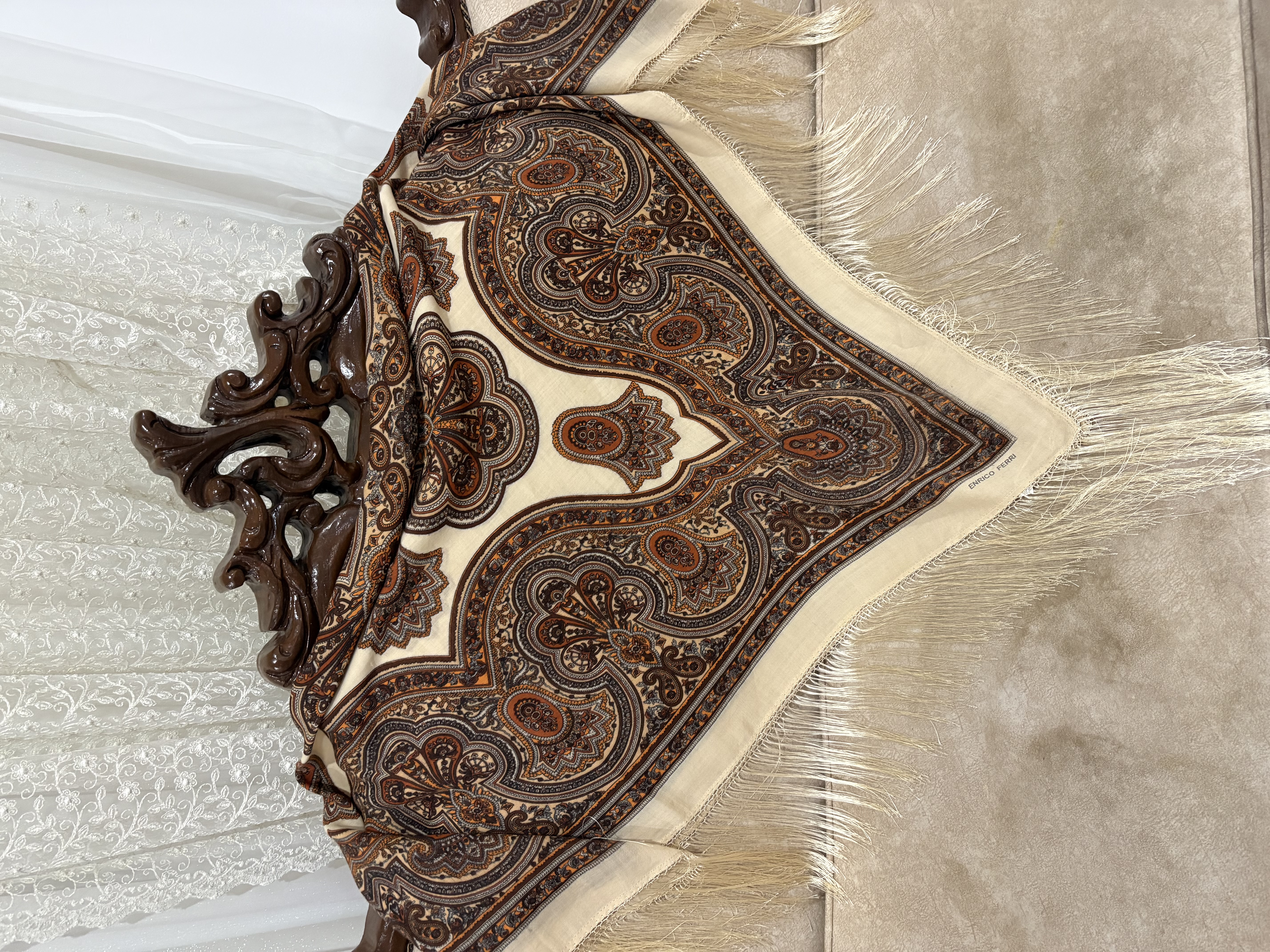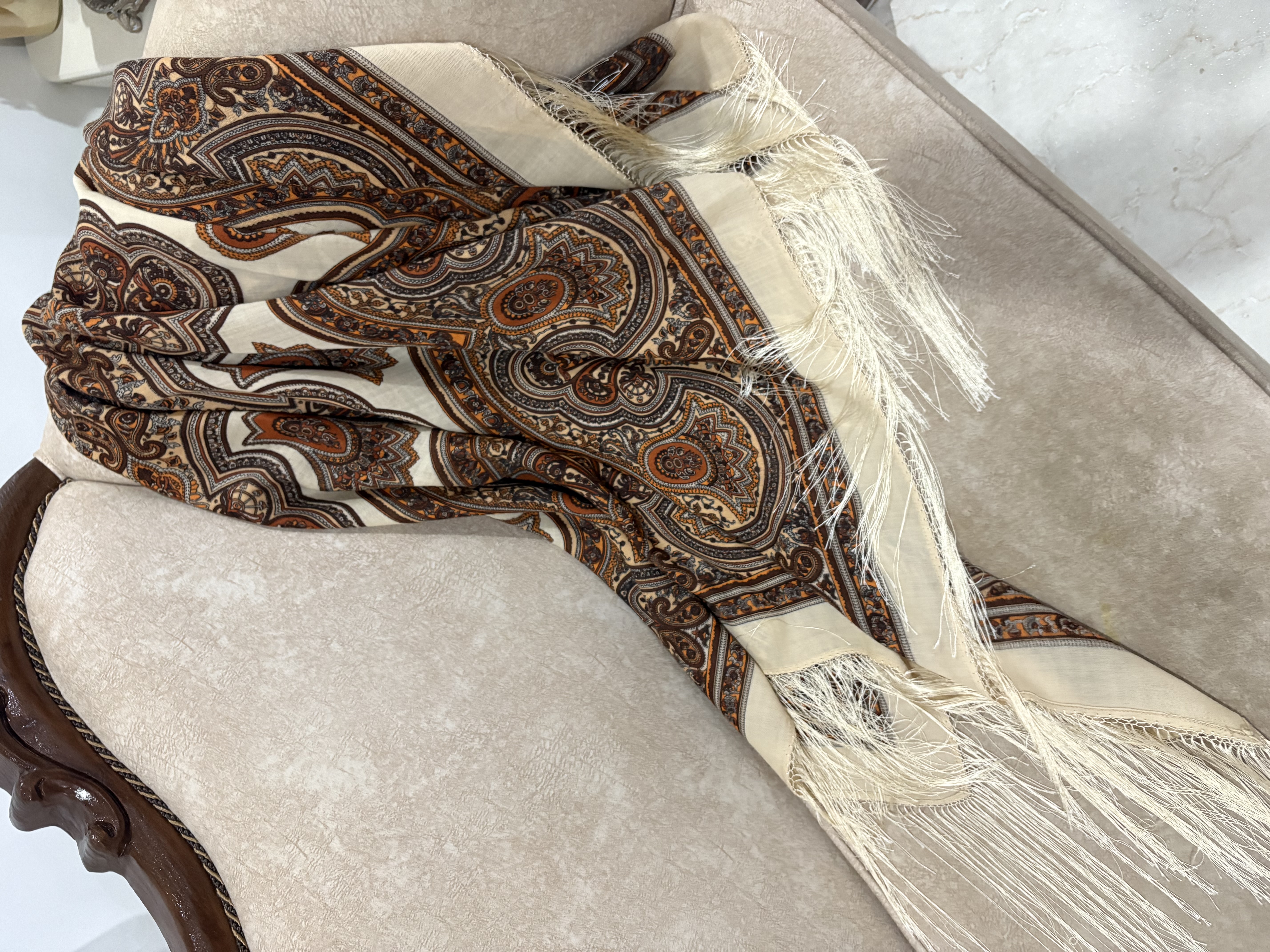 چارقد ایتالیایی از (برند کمیاب انریکه فیری) ،زمینه روشن با نقش ونگار شکلاتی و ریشه های شیری عروسانه،حسابی غوغا پیدا کرده، رنگ بهاری و شیک یه ترکیب بی نظیر برای روزهای بهار تابستان وحتی پاییز هزار رنگ.
