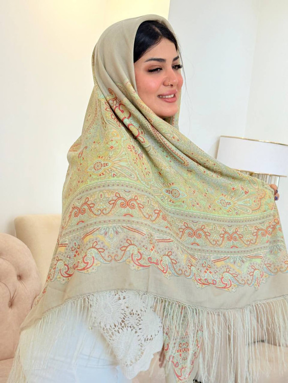 چارقد ایتالیایی طرح ترمه با ترکیب رنگ لطیف سبز پستهای و فیلی، انتخابی شیک و اصیل برای بانوانی است که به استایل کلاسیک و لوکس اهمیت میدهند. این چارقد با نقوش ظریف پیزلی و ترمهای، جلوهای بسیار چشمنواز دارد و ریشههای بلند و خوشفرم آن، زیبایی و وقار خاصی به استایل شما میبخشد.
