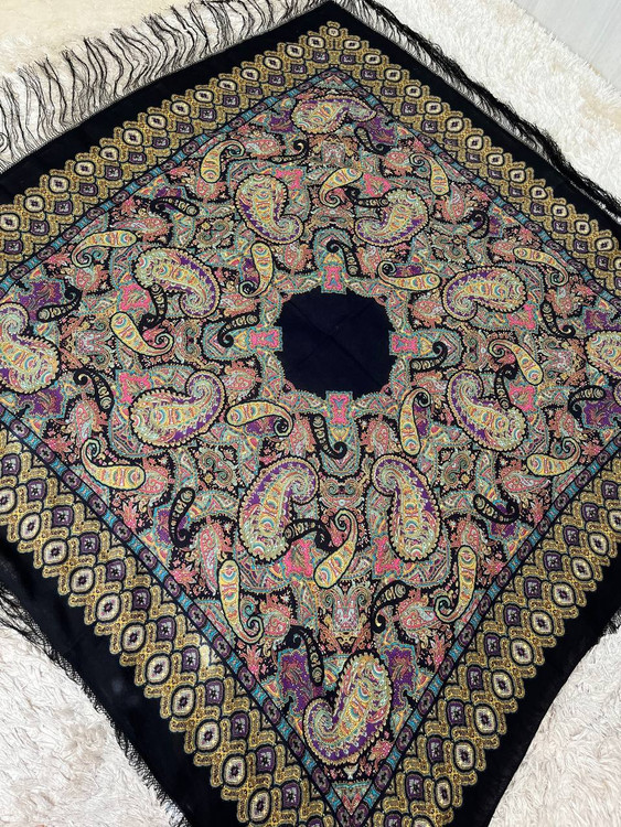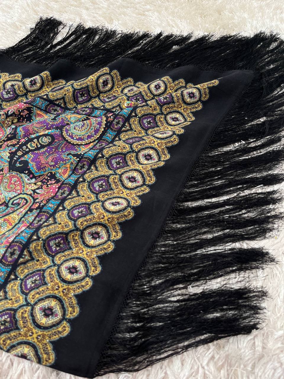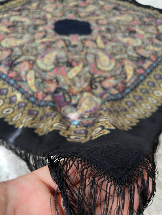 نوع: چارقد ایتالیایی طرح: بتهجقه (Paisley) پرنقش جنس: پارچه لطیف و سبک رنگ زمینه: مشکی ویژگیها: نوع: چارقد ایتالیایی طرح: بتهجقه (Paisley) پرنپرنقش و زیبا رنگبندی غنی و زنده حاشیه و ریشهدوزی ظریف ایستایی زیبا روی سر مناسب برای: استایل مجلسی و کلاسیک