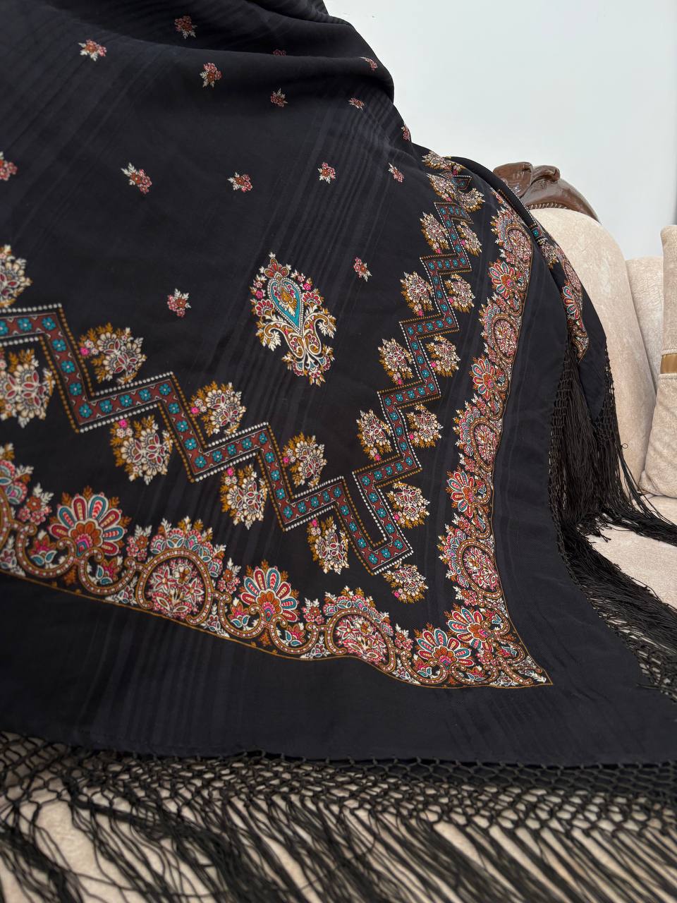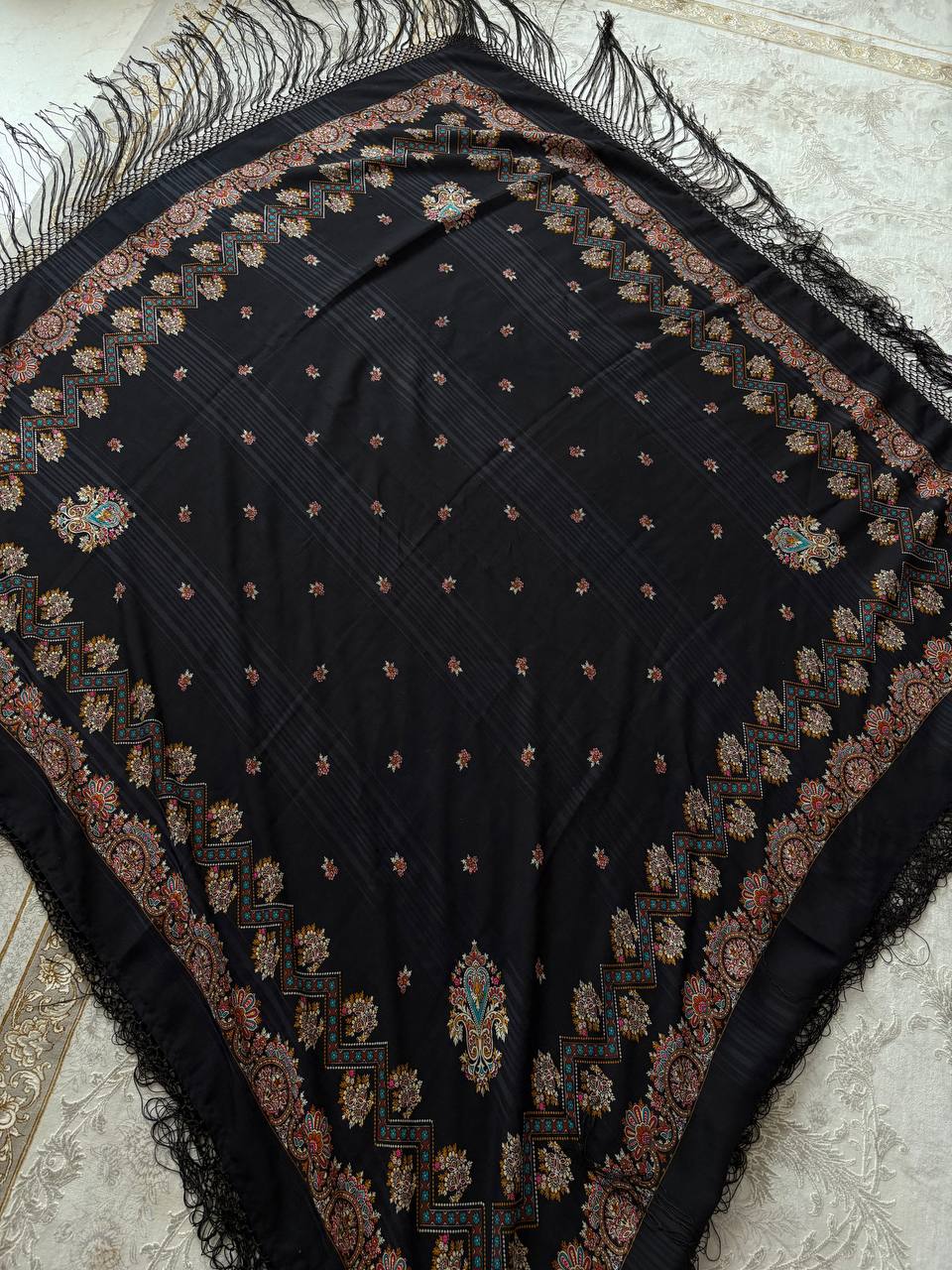نوع: چارقد پشمی روس جنس: پشم لطیف و گرم رنگ زمینه: مشکی طرح: سنتی / ترمهای حاشیه: ریشهدار مناسب فصل: پاییز و زمستان کاربرد: روزمره، مجلسی، هدیه: تراکم بالا و بسیار شیک