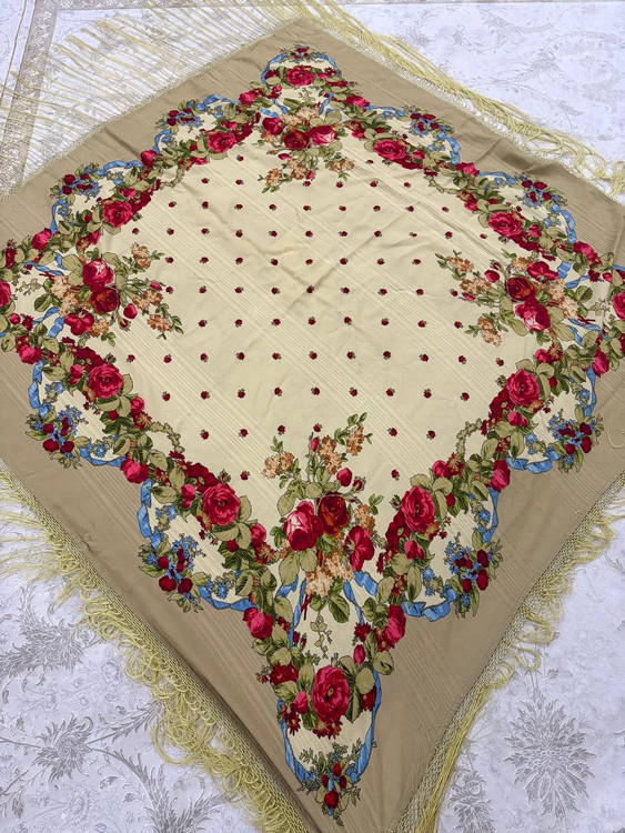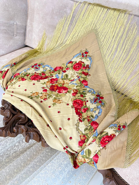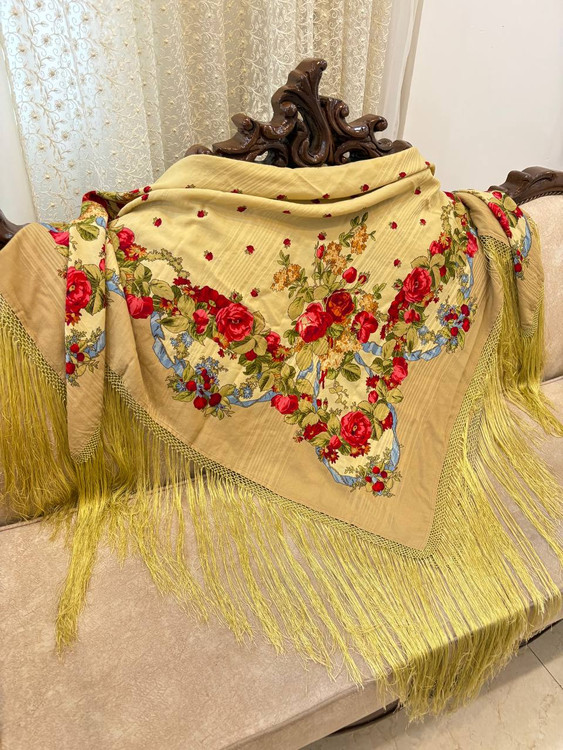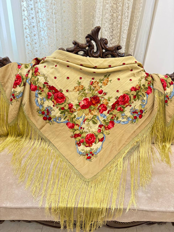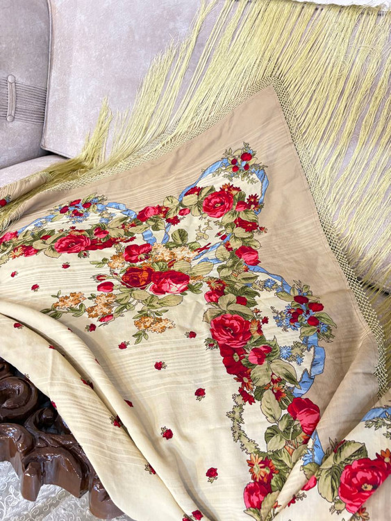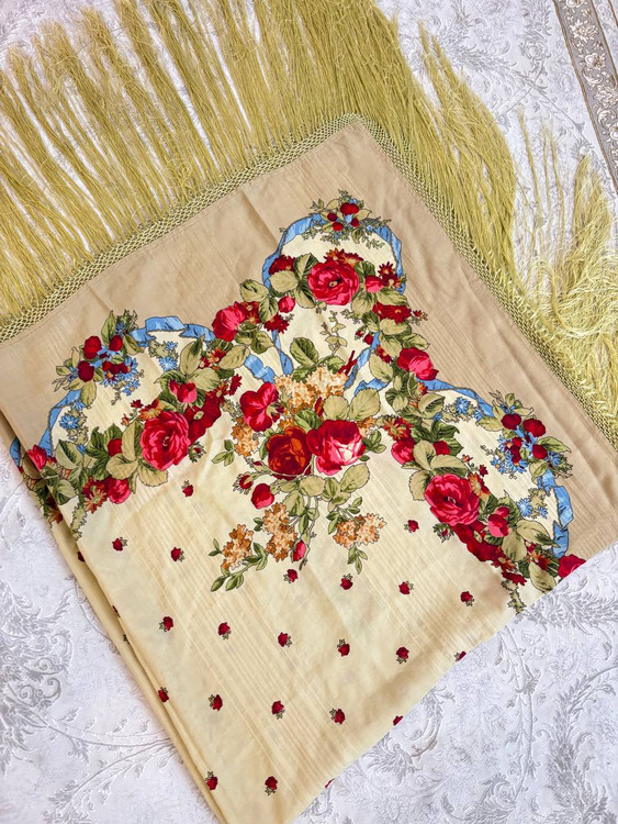 نوع: چارقد پشمی روس جنس: پشم لطیف طرح: گلدار سنتی (رز قرمز کلاسیک) رنگ زمینه: کرم / شیری حاشیه: ریشهدار بلند ابعاد: ۱۴۵ مناسب برای: پاییز و زمستان کاربرد: استایل سنتی، روزمره، مجلسی، هدیه: رنگ نخودی کمیاب