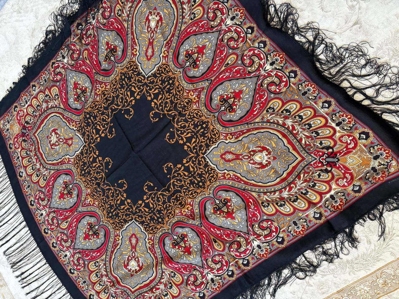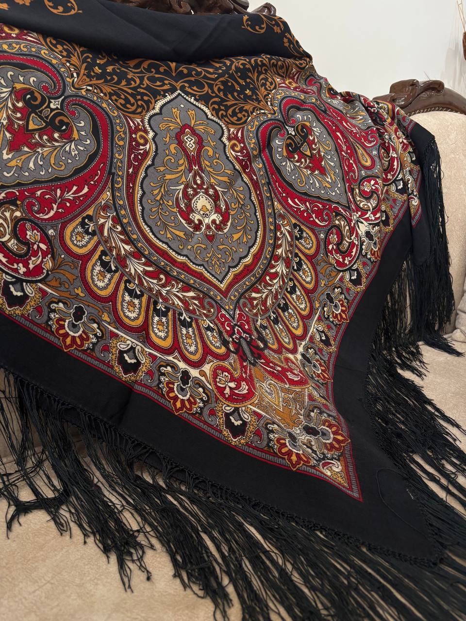 چارقدی شیک با نقوش کلاسیک و رنگبندی اصیل، مناسب استایل مجلسی و روزمره. جنس لطیف با ایستایی مناسب که روی سر فرم زیبایی میگیرد و سر نمیخورد. دارای ریشهدوزی ظریف در لبهها.