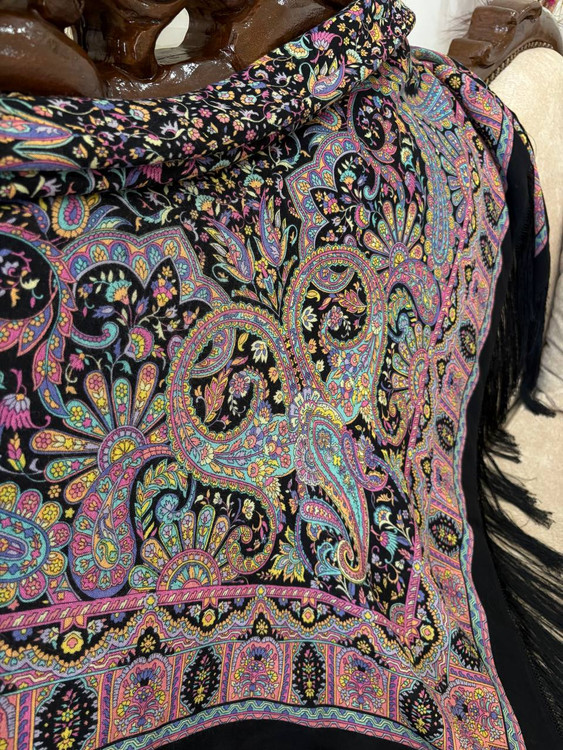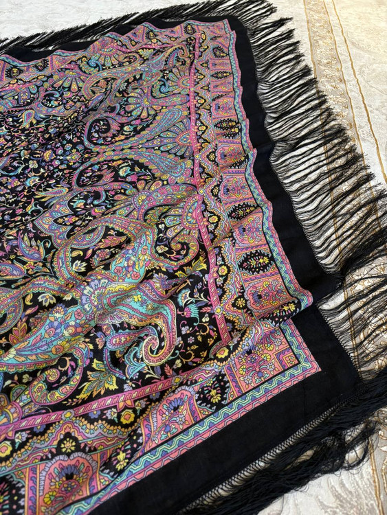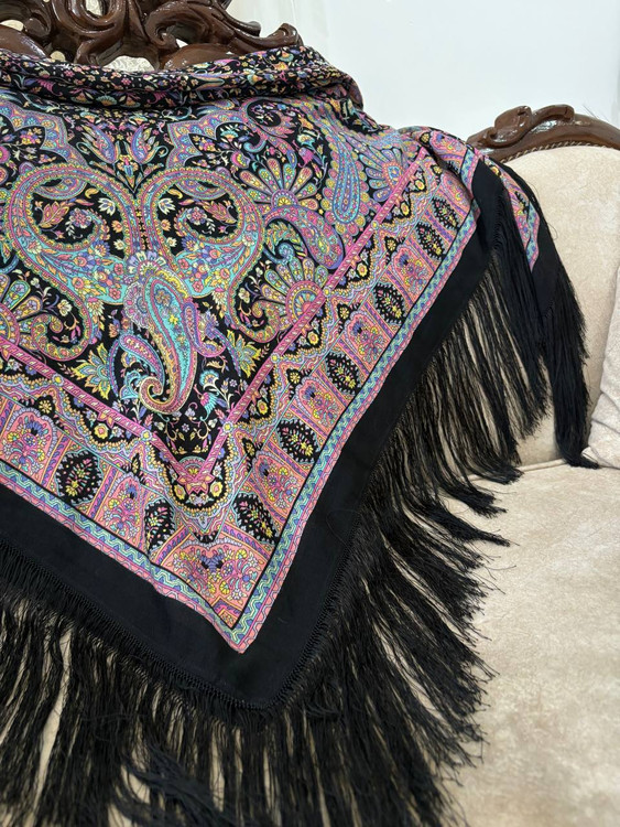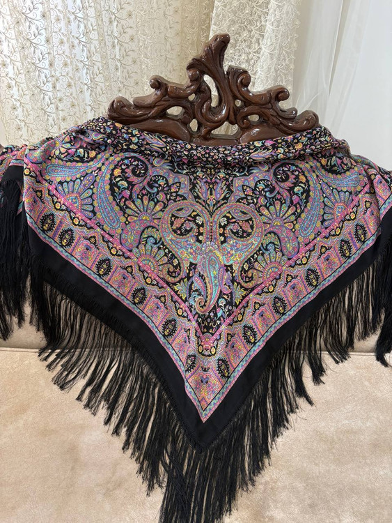 چارقدی فاخر با نقوش ظریف و رنگبندی چشمنواز، مناسب استایلهای مجلسی و سنتی.