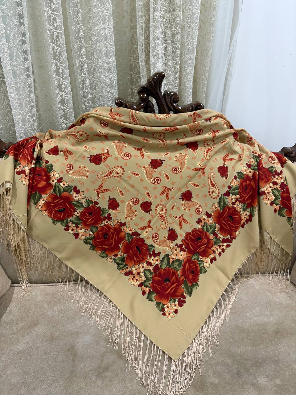 چارقد نخی ترک سایز ۱۴۰ با طرح اصیل گلدار ترکمنی، سبک و لطیف با ایستایی زیبا روی سر و شانه. انتخابی شیک برای استفاده روزمره و مجلسی✨👌