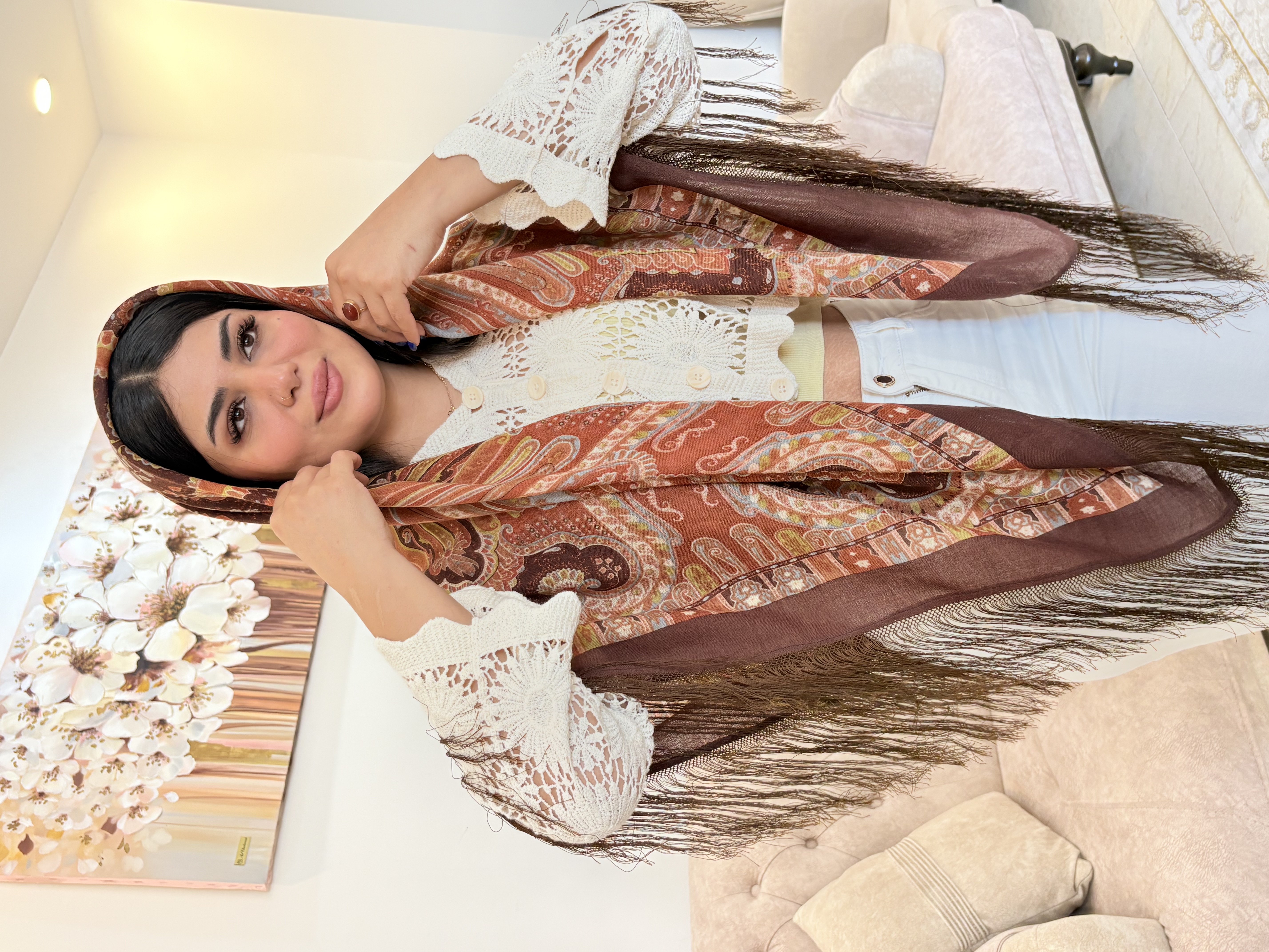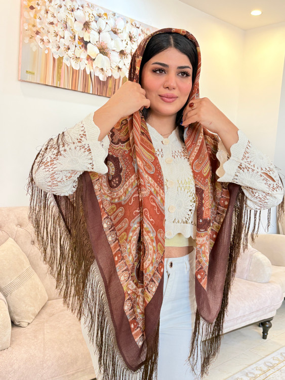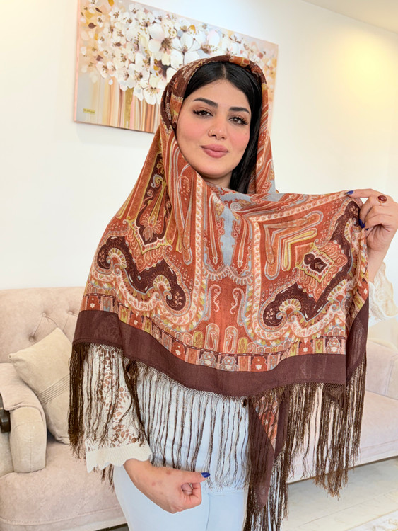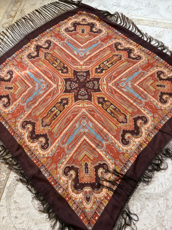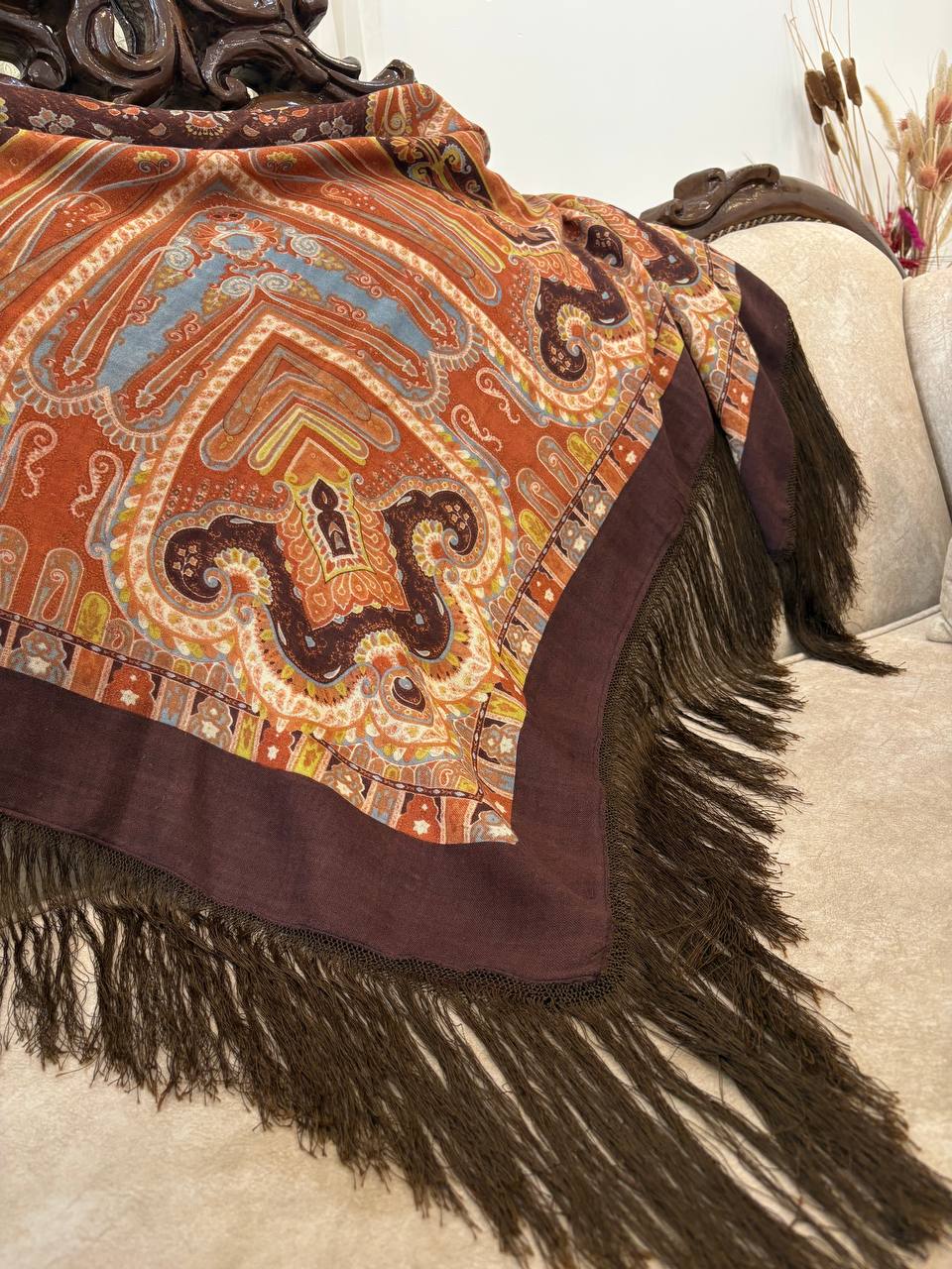 چارقد ایتالیایی طرح اصیل با نقوش کلاسیک و حاشیه ریشهدار.