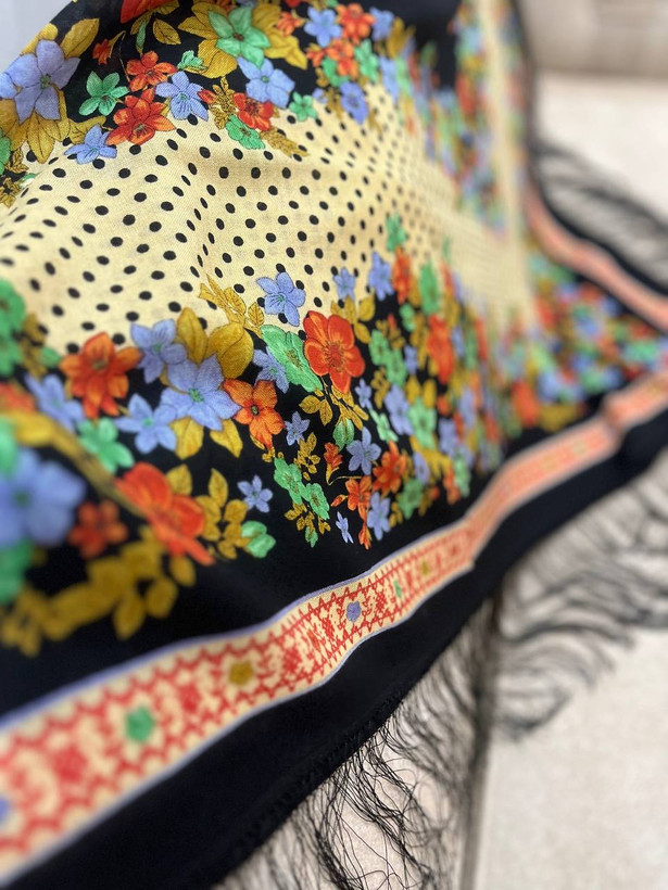 چارقد ایتالیایی طرح اصیل با نقوش کلاسیک و حاشیه ریشهدار.