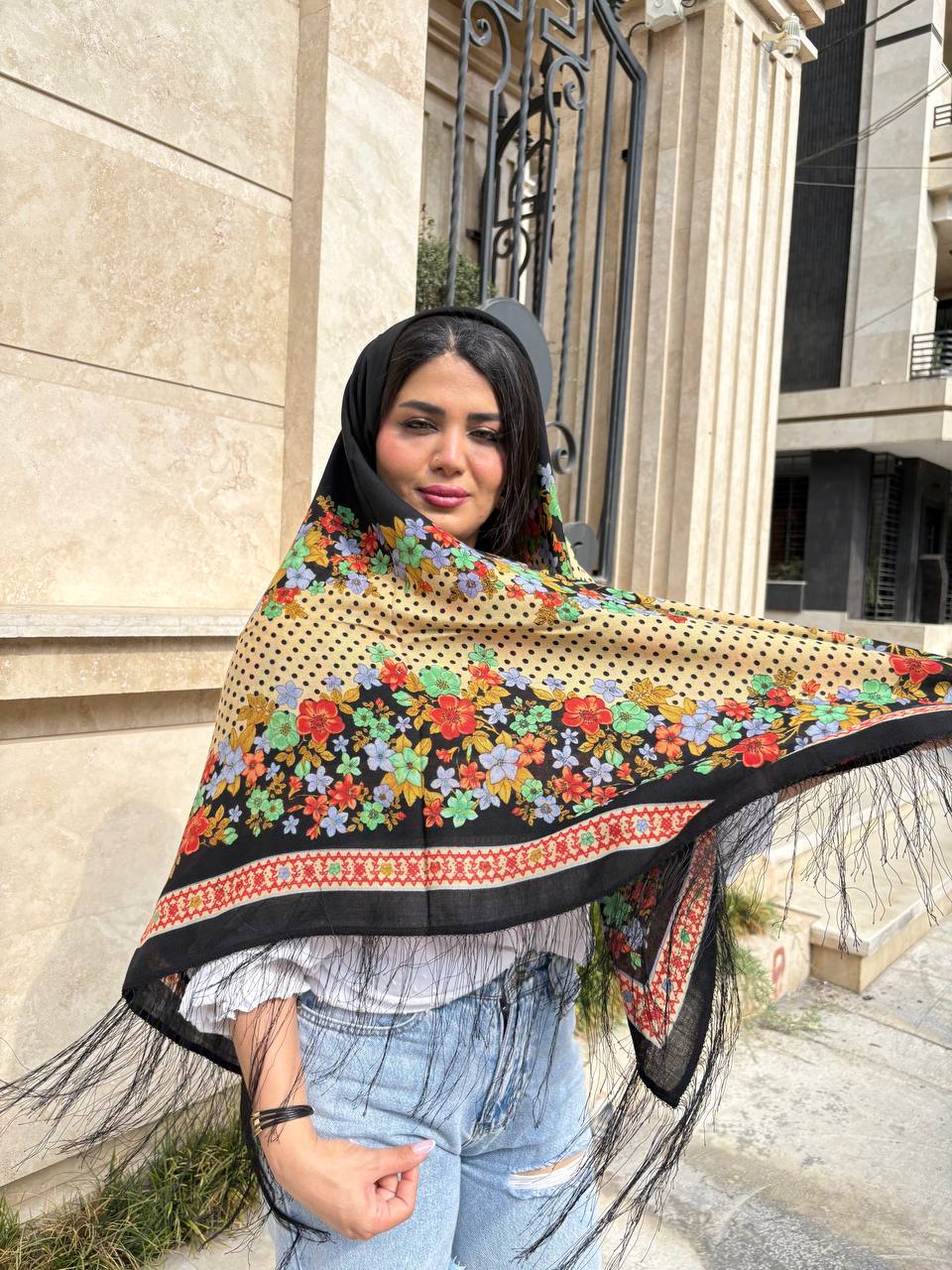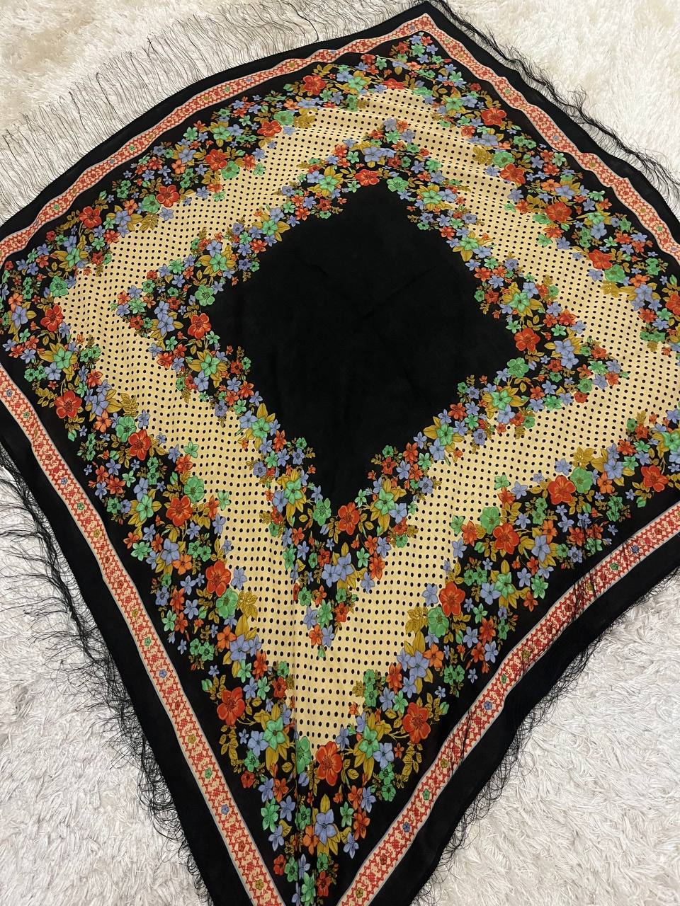 چارقد ایتالیایی طرح اصیل با نقوش کلاسیک و حاشیه ریشهدار.