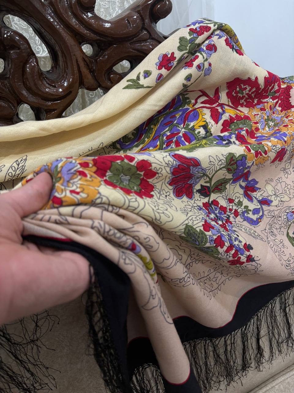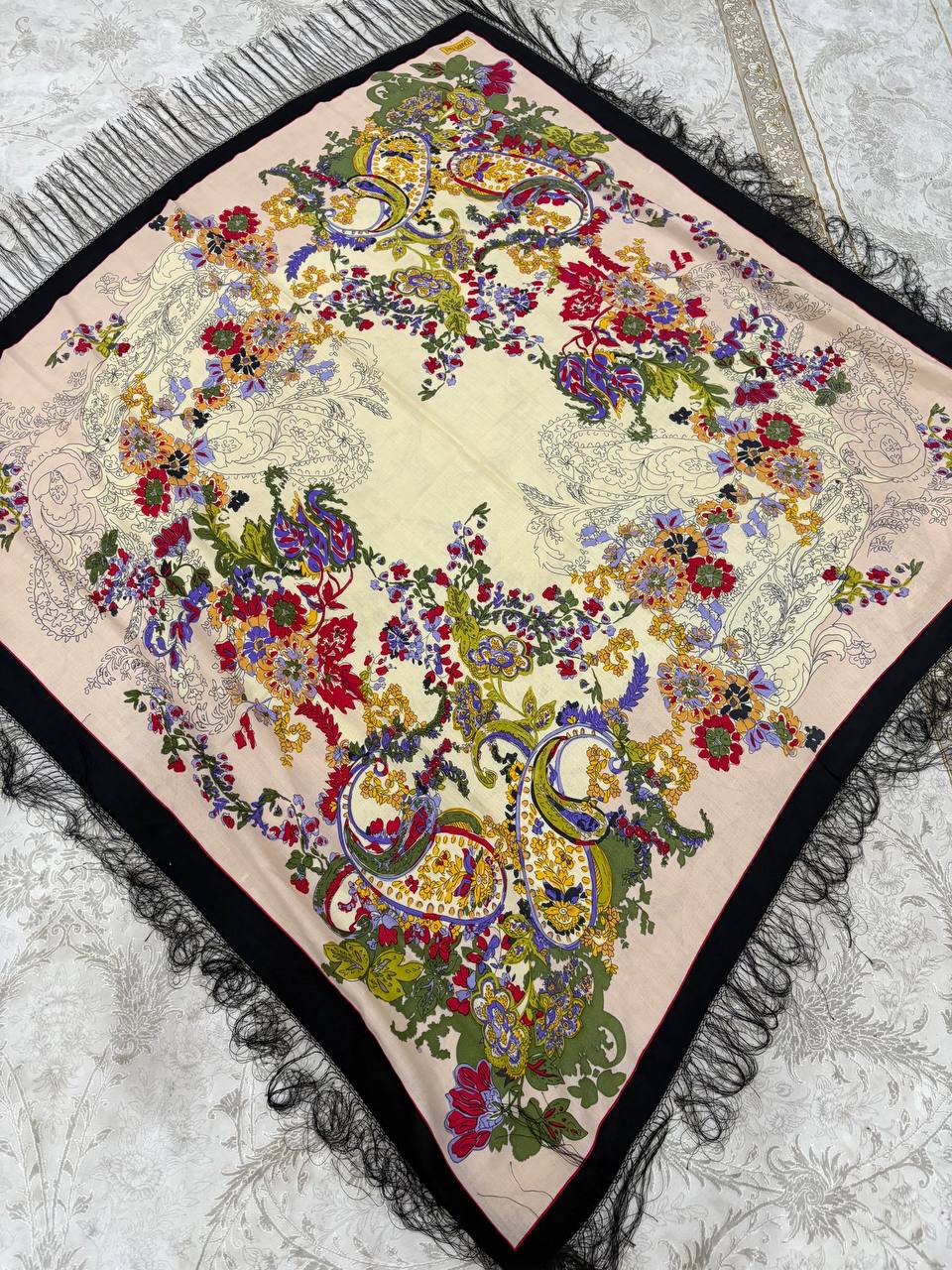 نوع: چارقد زنانه ایتالیایی جنس: نخ و ابریشم لطیف (سبک و خوشفرم) طرح: گلدار و بتهجقه سنتی با الهام کلاسیک رنگ زمینه: کرم روشن با حاشیه مشکی دوردوزی: ریشهدار ظریف مناسب: استفاده روزمره، مجلسی و ست لباس ترکمنی ابعاد: استاندارد چارقد (مناسب بستن سنتی): .