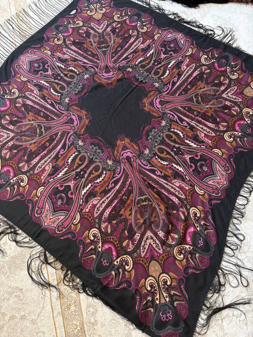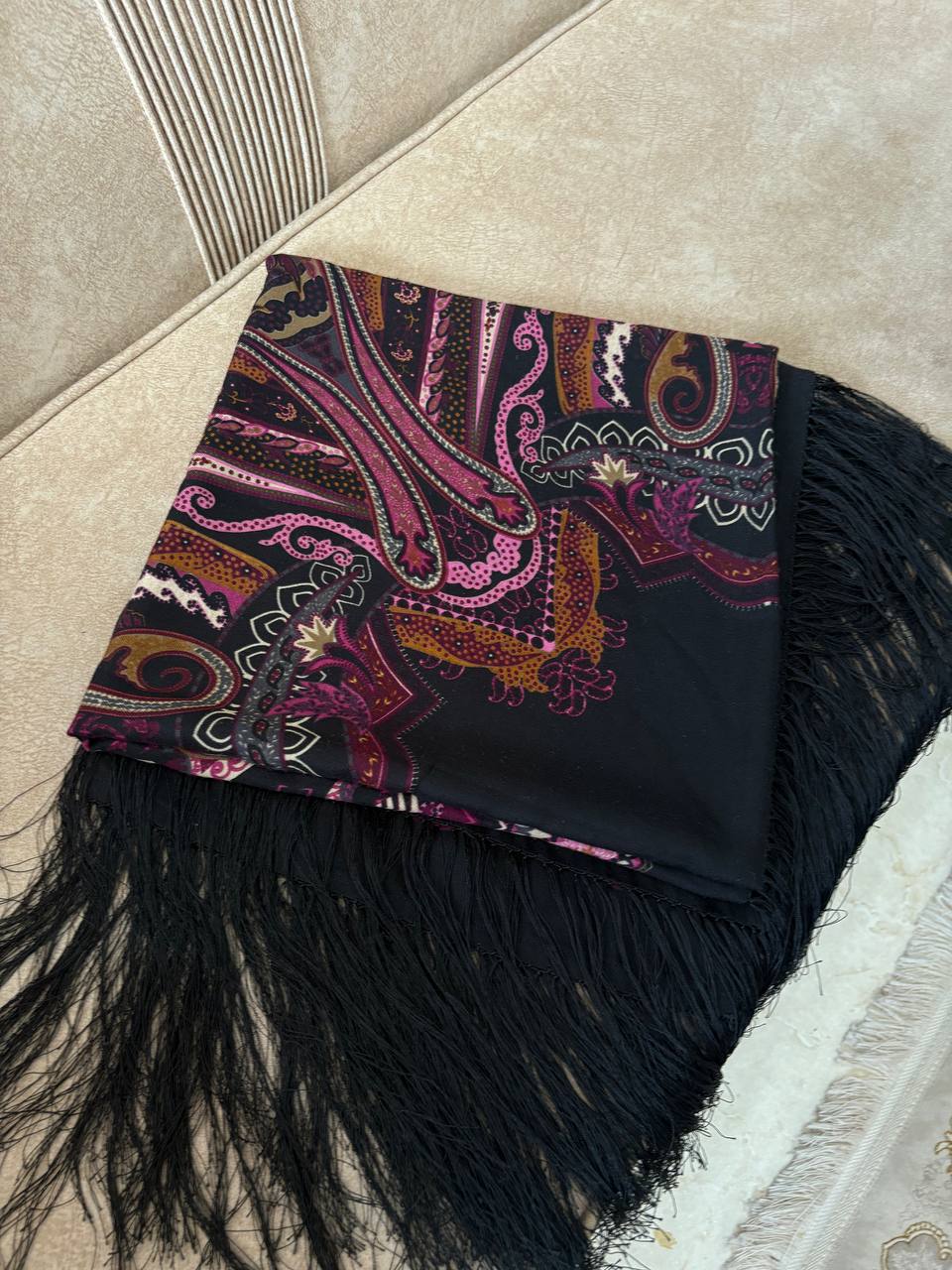 نوع: چارقد زنانه (ایتالیایی) جنس: پارچه لطیف و خوشافت طرح: بتهجقه و اسلیمی کلاسیک رنگ غالب: مشکی با طیف زرشکی، بنفش و طلایی حاشیه: ریشهدار بلند ابعاد: قواره بزرگ، مناسب بستن ترکمنی و مجلسی کاربرد: استایل سنتی، مجلسی و خاصپسند: .