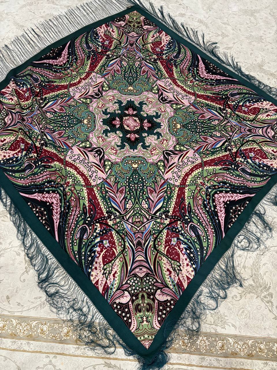نوع: چارقد زنانه (ایتالیایی) جنس: پارچه لطیف و باکیفیت طرح: بتهجقه و نقوش سنتی متقارن رنگ غالب: سبز یشمی با ترکیب صورتی، زرشکی و کرم حاشیه: ریشهدار بلند به رنگ سبز ابعاد: قواره بزرگ، مناسب بستن ترکمنی و مجلسی کاربرد: استایل سنتی، خاص و شیکپسند: .