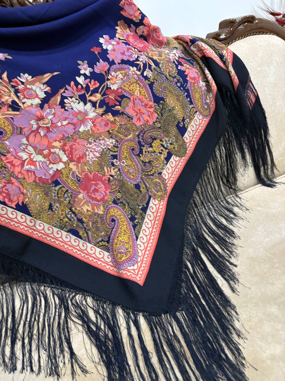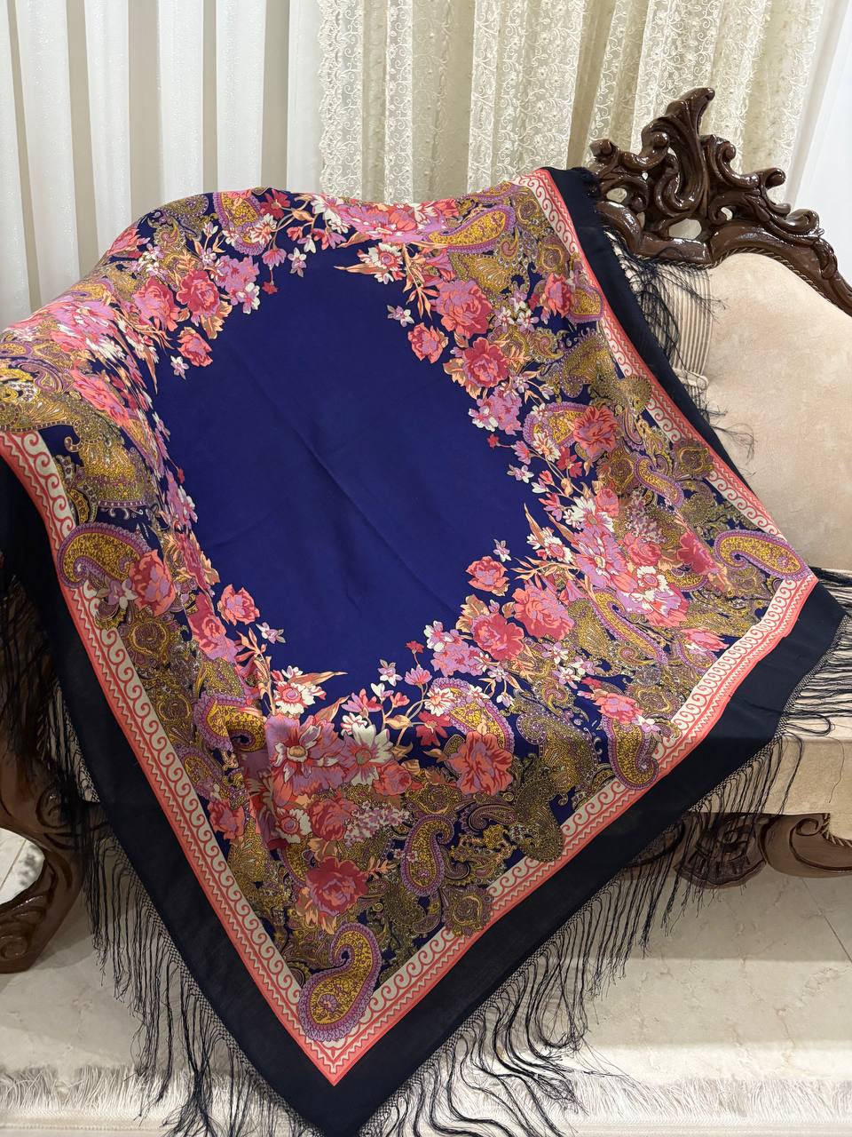 نوع: چارقد زنانه (ایتالیایی) جنس: پارچه لطیف و خوشافت طرح: گلدار و بتهجقه کلاسیک رنگ غالب: سرمهای با ترکیب صورتی، طلایی و یاسی حاشیه: ریشهدار بلند به رنگ مشکی ابعاد: قواره بزرگ، مناسب بستن ترکمنی و مجلسی کاربرد: استایل سنتی، مجلسی و فاخر: ..